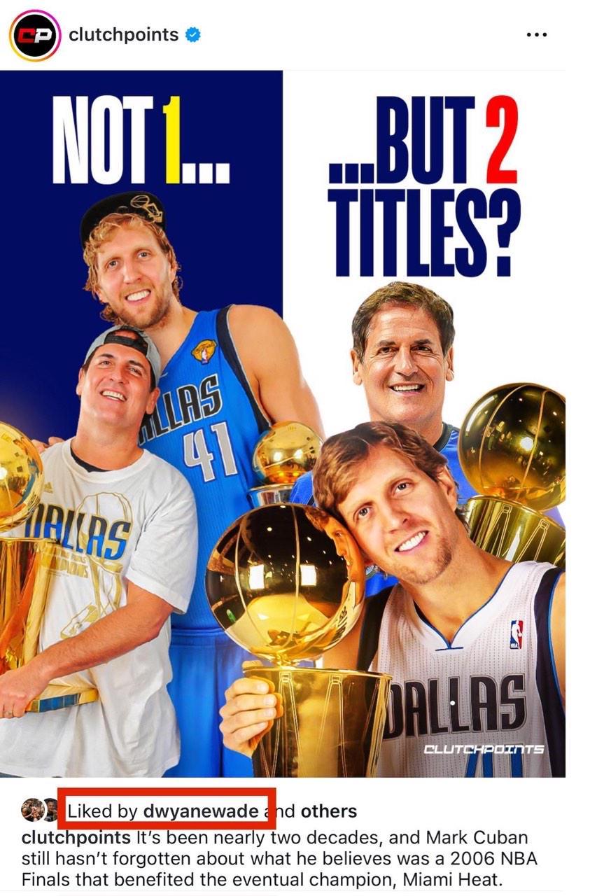 雷速体育8月30日讯 美媒ClutchPoints今日更新了社交媒体,晒出了热火名宿韦德点赞了独行侠前老板库班言论的截图。
