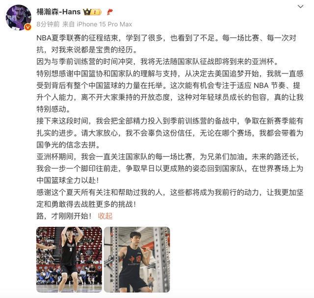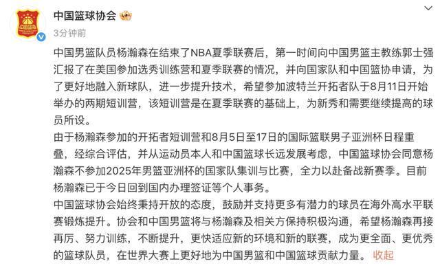 由于杨瀚森参加的开拓者短训营和8月5日至17日的国际篮联男子亚洲杯日程重叠,经综合评估,并从运动员本人和中国篮球长远发展考虑,中国篮球协会同意杨瀚森不参加2025年男篮亚洲杯的国家队集训与比赛,全力以赴备战新赛季。目前杨瀚森已于今日回到国内办理签证等个人事务。